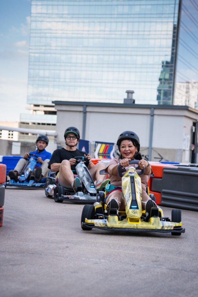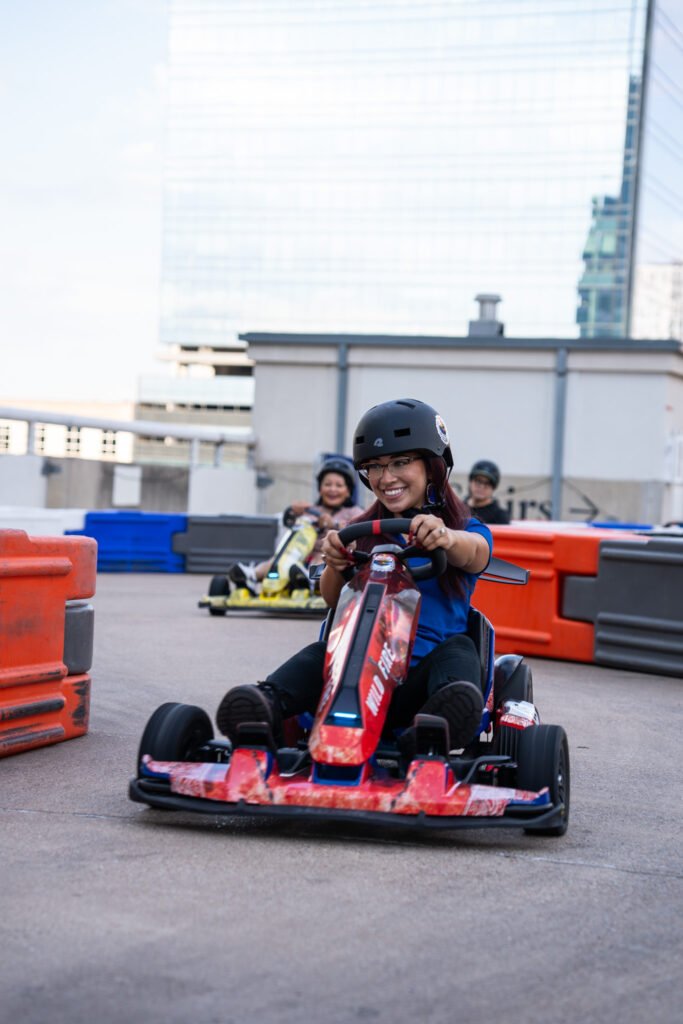 Up to 5 people would get to go around the temporary track once before a professional driver was released onto the course to catch up to and pass them. The go kart catchers were professional racers Cameron Das and Scott Speed.